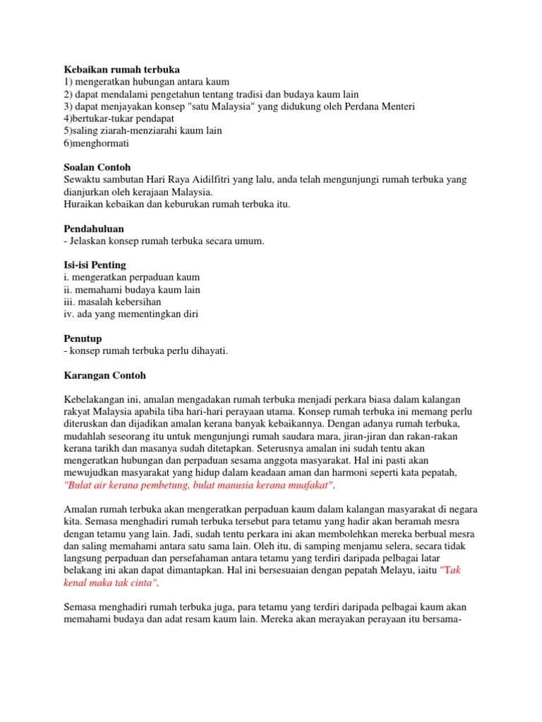 Huraikan kepentingan amalan rumah terbuka kepada masyarakat dan negara. Doc karangan contoh spm rumah terbuka firdaus zukrie academia edu. Amalan rumah terbuka sudah menjadi lumrah untuk sambutan perayaan di negara ini termasuk hari raya aidilfitri, deepavali, tahun baru cina dan hari krismas. Perayaan seperti ini tidak lengkap jika tiada rumah terbuka sehingga pelbagai lapisan masyarakat mengetahui istilah rumah … Kebaikan amalan rumah terbuka kepada rakyat malaysia.